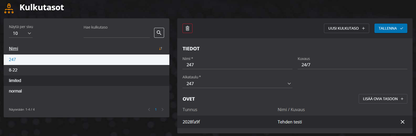 Kulkutasot-sivulta löytyvät kaikki kulkuoikeudet, mitä olette pyytäneet konfiguroijaa luomaan. Jokaiselle kulkutasolle täytyy antaa nimi ja siihen liittää Aikataulut-sivulla tehty aikataulu, sekä kaikki ovet, joilla kyseinen kulkutaso toimii.