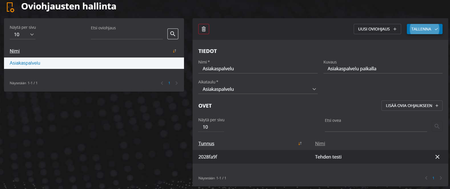 Paina ensin Uusi oviohjaus -painiketta, jonka jälkeen ohjaukselle määritetään vähintään nimi, Aikataulut-sivulla määritetty aikataulu alasvetovalikosta sekä mitä ovia ohjaus koskee. Muista tämän jälkeen napsauttaa Tallenna-painiketta.