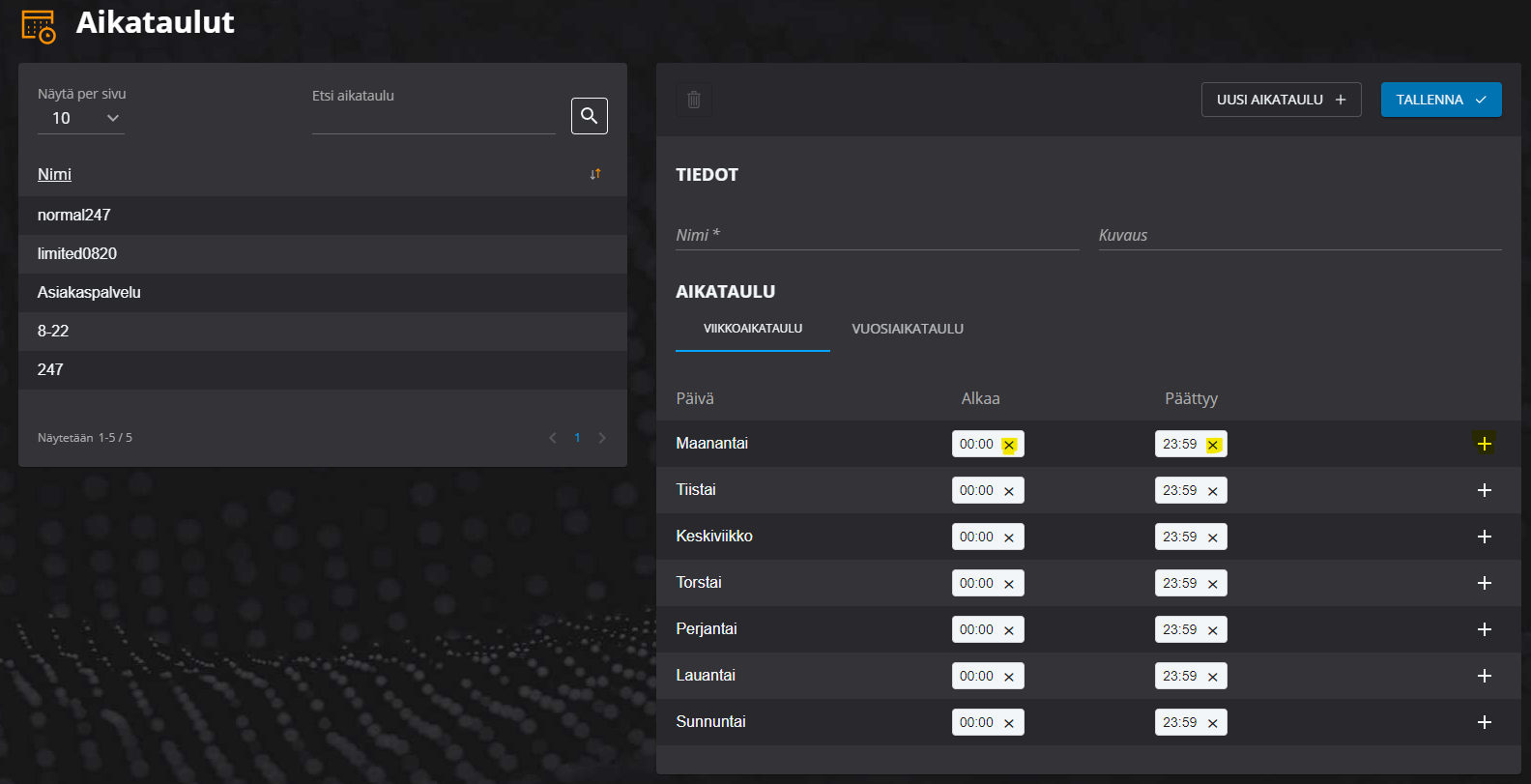 Aikataulut-sivulla voitte luoda uusia aikatauluja oviohjauksia tai kulkutasoja varten. Uusi aikataulu -painikkeen painamisen jälkeen täytyy aikataululle antaa nimi ja määrittää ajat, jolloin ovesta pääsee sisälle / ovi on auki. Aika napsauttamalla näkyviin tulee rullausvalikko, jolla pystyy valitsemaan haluamansa ajan. Pieniä rakseja painamalla voi joltain päivältä poistaa kaikki ajanmääreet. Jos samalle päivälle haluaa sirpaleisen aikataulun, voi painaa sivussa olevaa plussaa. Tällöin saat luotua esimerkiksi toisen maanantaipäivän, jolle voit asettaa eri ajanmääreet.