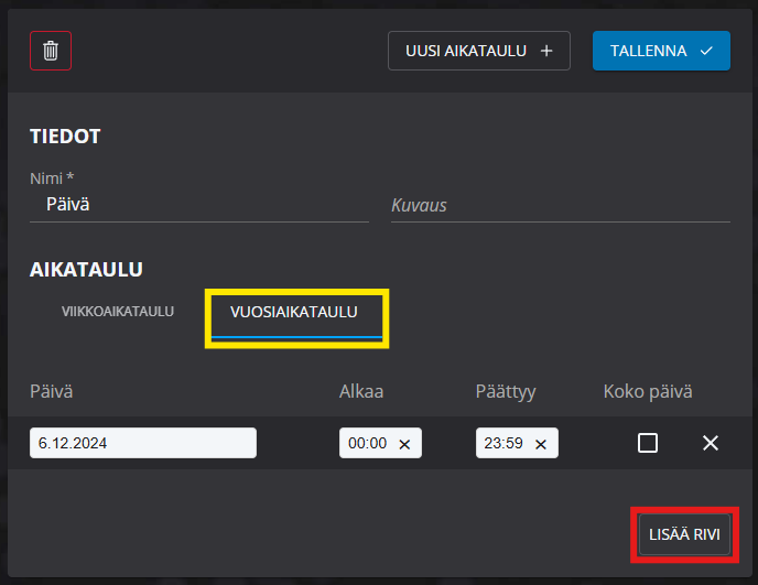 Välillä voi olla tarpeen poiketa normaalista aikataulusta, esimerkiksi jos salin oven halutaan olevan normaalia pidempään auki tai ovi pidetään arkipyhänä lukittuna. Poikkeusaikataulun voi luoda menemällä valitun aikataulun vuosiaikataulu-välilehdelle. Lisää rivi oikeasta alakulmasta. Määritä riville päivämäärä ja kellonaika, milloin haluat oven olevan auki. Jos oven halutaan olla lukittuna koko päivän, voi kellonaikojen vierestä painaa pieniä rasteja. Muista painaa lopuksi tallenna. Kun ovi on lukittu, ovesta pääsee edelleen kulkemaan kulkutunnisteella tai PIN-koodilla.