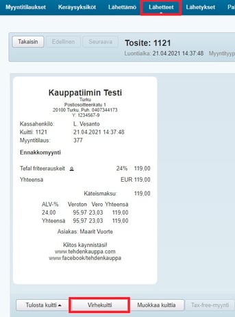 - Klikkaa lähetteen luontiaikaa ja tee tositteesta virhekuitti.