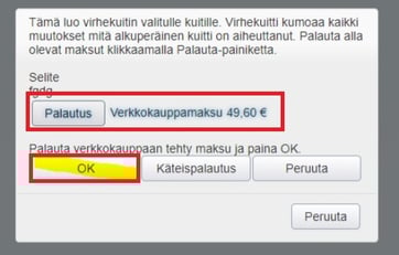 - Klikkaa sitten Palautus-painiketta. Tehden ilmoittaa summan, joka sinun tulee palauttaa asiakkaalle esim. verkkokaupan kautta. Klikkaa vielä OK-painiketta (tai valitse käteispalautus, jos haluat palauttaa summan asiakkaalle käteisenä):