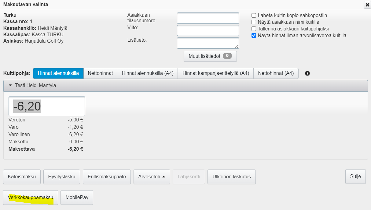 - Napsauta Käsittele palautus heti kassalla -painiketta. Kassalla päätä palautus esimerkiksi Verkkokauppamaksu-maksutapaan (maksutapa, jota kautta summa on palautettu/palautetaan asiakkaalle):