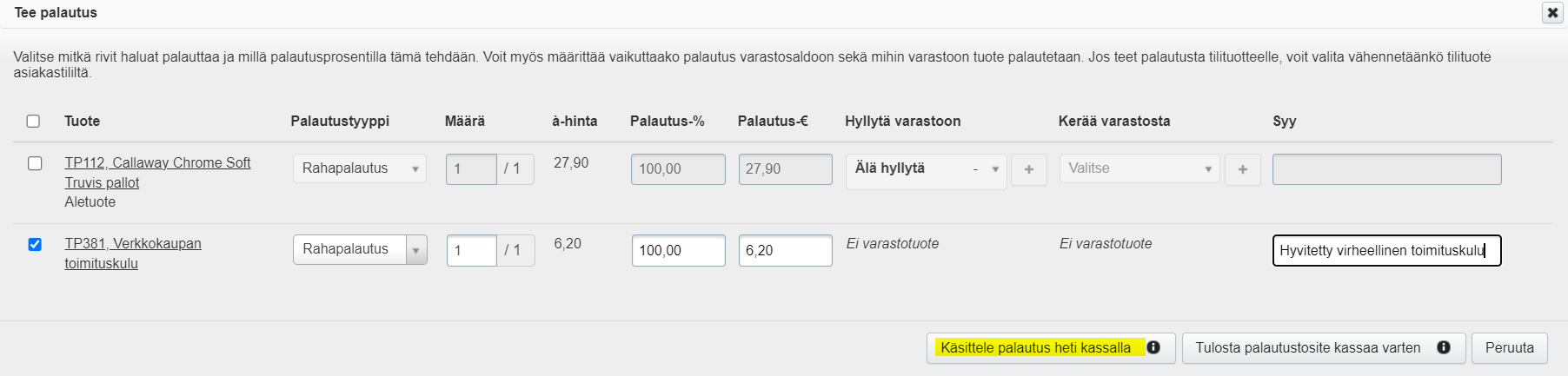 - Valitse Käsittele palautus heti kassalla ja valitse kassalla haluamasi hyvitystapa.