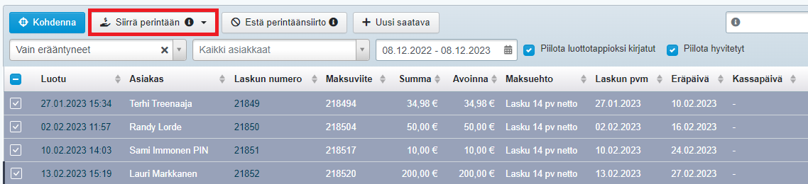 - Valitse perintään siirrettävä saatava ja klikkaa Siirrä perintään -painiketta.