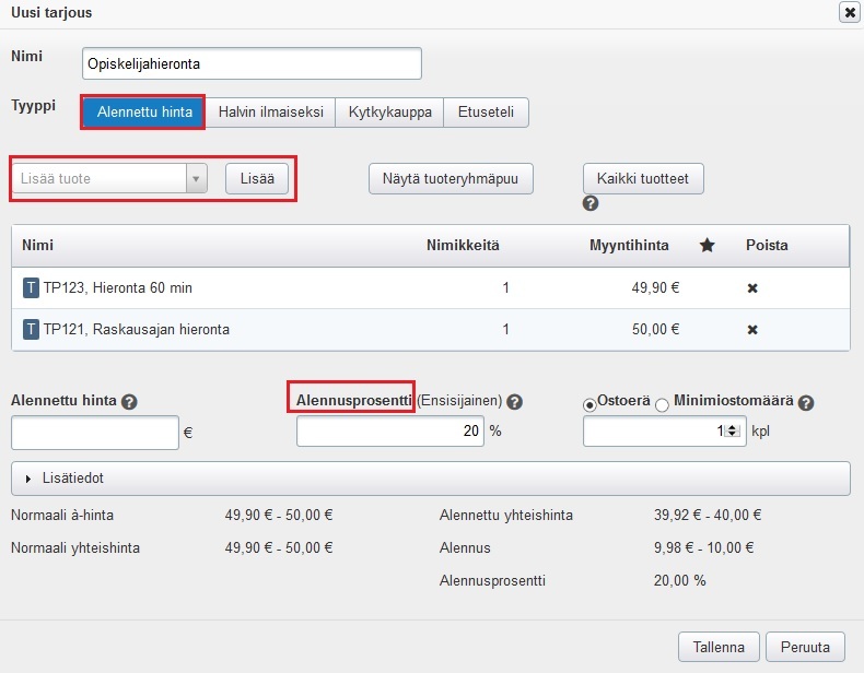 - Klikkaa Uusi tarjous -painiketta. Anna tarjoukselle nimi, joka näkyy asiakkaille. Tarjouksen tyypiksi valitaan Alennettu hinta.