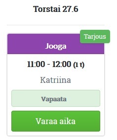 - Jos palvelun voi varata Avoinna24-ajanvarauspalvelussa, asiakas näkee Happy Hour -alennettujen palveluiden kohdalla parhaasta tarjouksesta kertovan kuvakkeen, joka vaihtelee sen mukaan onko kyse ryhmäajanvarauksesta (Tarjous-teksti) vai palvelusta (alennettu hinta):