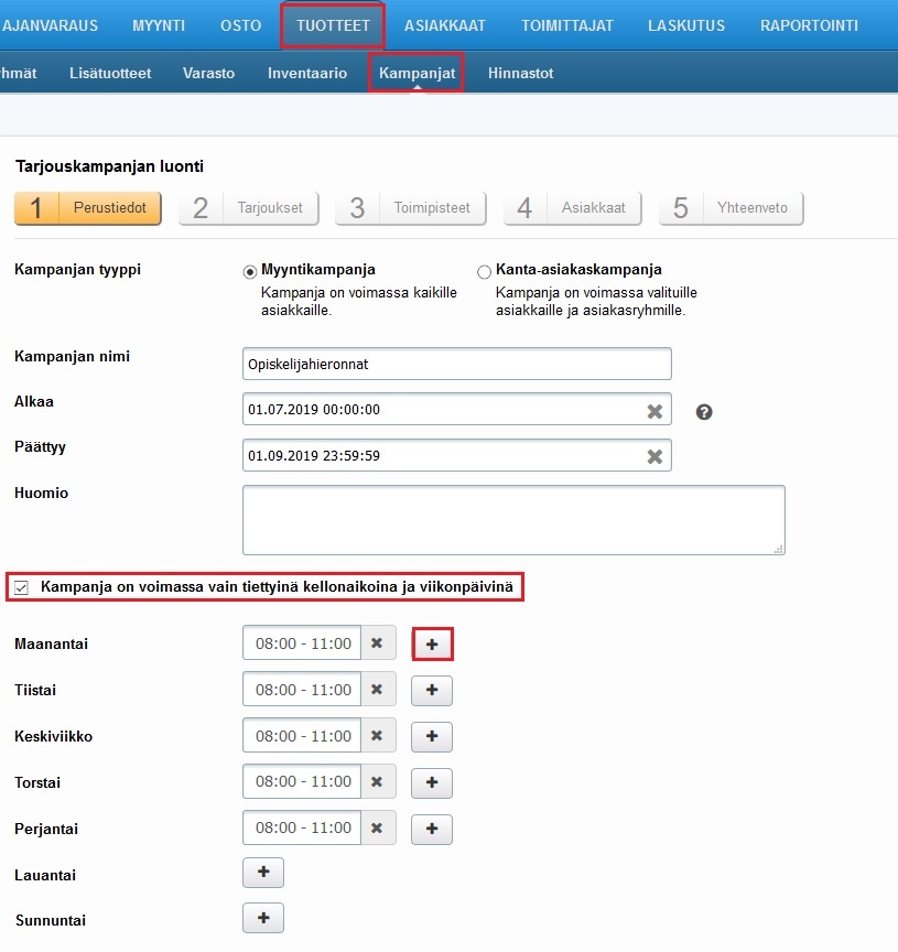 - Luo uusi kampanja. Valitse tyypiksi Myyntikampanja ja laita rasti ruutuun kohtaan Kampanja on voimassa vain tiettyinä kellonaikoina ja viikonpäivinä.