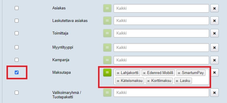 - Laita rasti Maksutapa-suodattimen eteen, Jos haluat tarkastella nimenomaan tiettyjen maksutapojen käyttöä, valitse ne pudotusvalikosta. Valikossa ovat mukana kaikki yrityksessäsi käytössä olevat maksutavat: