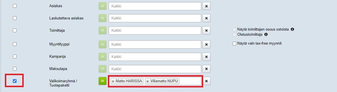 - Laita rasti Valikoimaryhmä/Tuotepaketti-suodattimen eteen ja valitse haluamasi valikoimaryhmä(t):