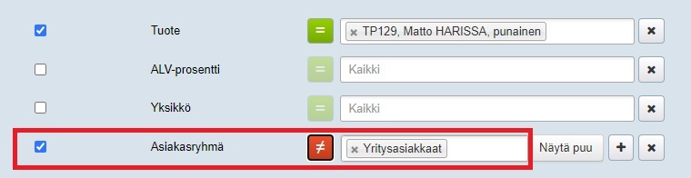 - Vinkki: Jos haluat rajata jonkin asiakasryhmän pois raportin tuloksilta, valitse asiakasryhmä ja klikkaa ryhmän edessä oleva vihreä yhtäsuuruusmerkki punaiseksi: