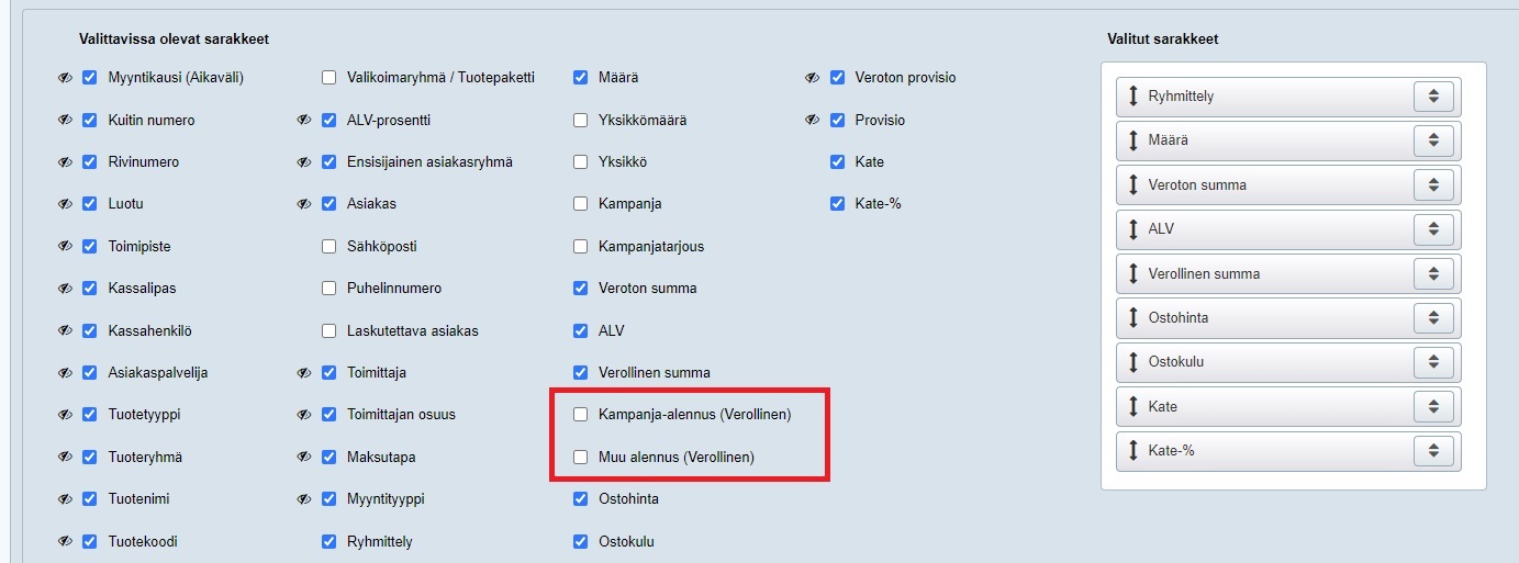 - Varmista ensin ylärivin Sarakkeet-painikkeesta klikkaamalla, että Kampanja-alennus (Verollinen) ja Muu alennus (verollinen) -sarakkeet on valittu mukaan raportille. Klikkaa niille rasti ruutuun, jos sitä ei jo ole. Sarakkeet avautuvat raporttivalintojen alle: