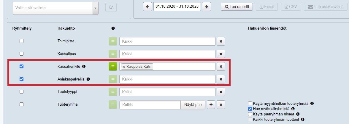 Myyntiraportilla voit suodattaa raportille haluamiesi tuoteryhmien myynnit. Tuoteryhmävalinnan vieressä on myös joukko lisäehtoja: