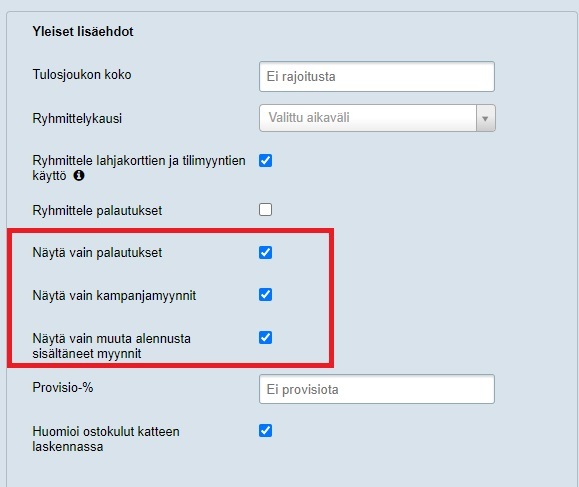 Toinen vaihtoehto on valita raportointinäkymän oikeassa laidassa että tuloksista näytetään vain palautukset, kampanjamyynnit tai muuta alennusta sisältäneet myynnit: