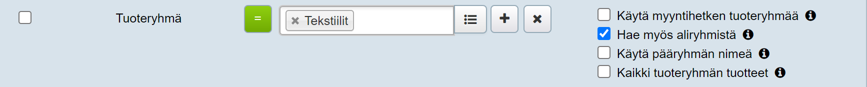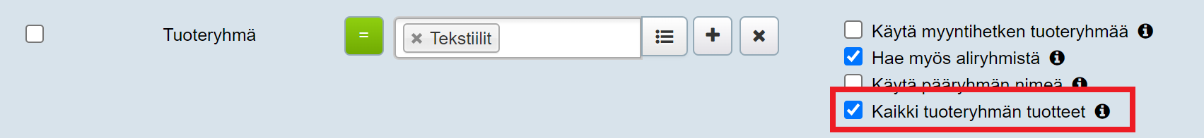 Tämä lisäehto on valittu oletuksena. Jos valitsemassasi tuoteryhmässä on aliryhmiä, raportti hakee myös ne. Tämä tarkoittaa myös sitä, että kun ryhmittelet tuotteita tuoteryhmiin, raportoinnin kannalta riittää, että tuote kuuluu aliryhmään, eli sitä ei tarvitse raportoinnin vuoksi lisätä mihinkään ylätason ryhmään (nk. juuriryhmä):