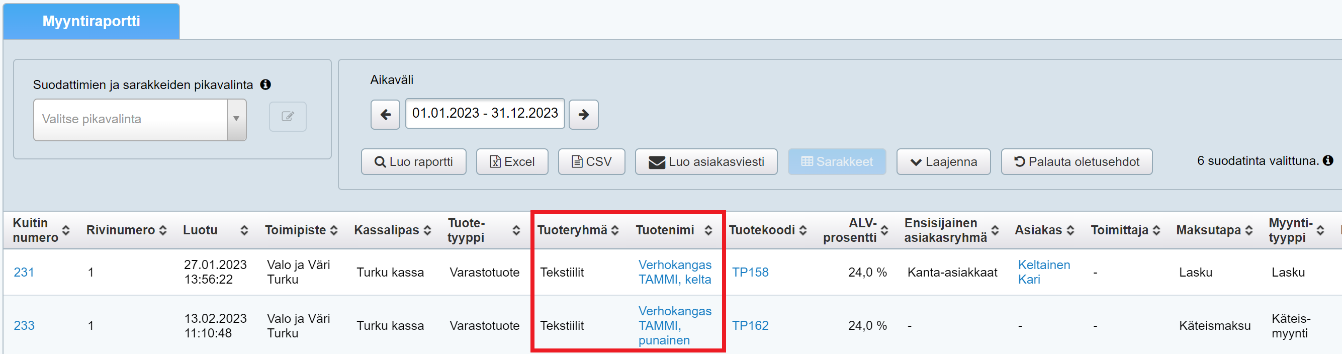 Esimerkki: TAMMI-verhokankaan ensisijainen tuoteryhmä on Verhot, mutta se kuuluu myös Tekstiilit-tuoteryhmään. Kun haet raporttiin Tekstiilit-tuoteryhmän tuotteet kuvan valinnoilla, TAMMI-verhokankaan myyntiä ei näy raportilla: