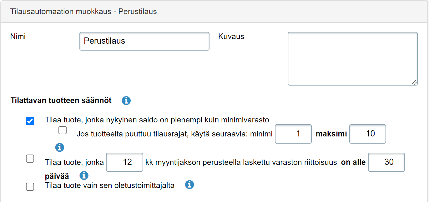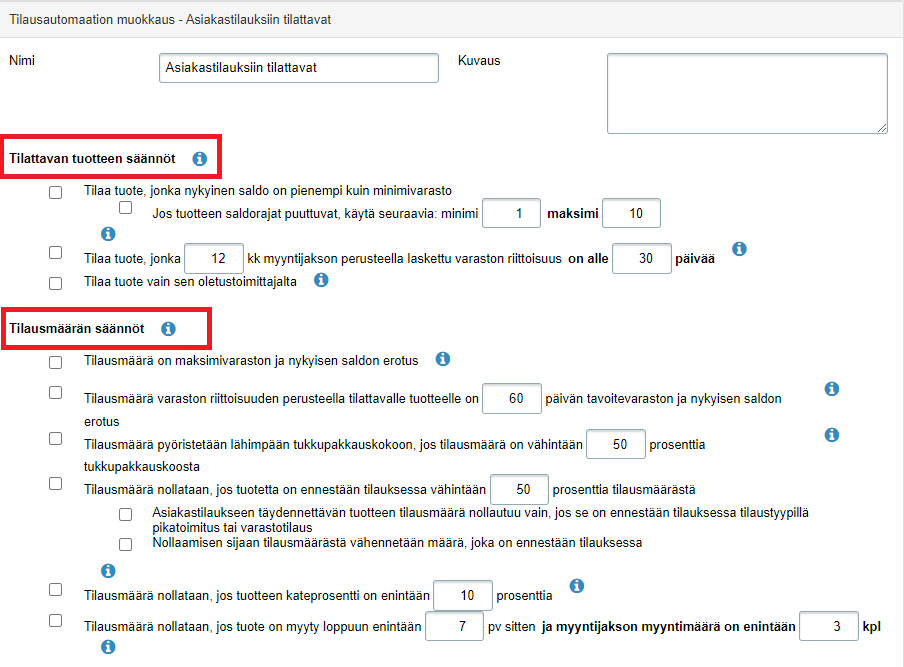- Kun jätät kaikki Tilattavan tuotteen säännöt- ja Tilausmäärän säännöt-osioiden kohdat valitsematta, automaatti ehdottaa tilattavaksi vain asiakastilausten täydennystä (eli tuotetta tilataan sen verran, että sen vapaa saldo on nolla):