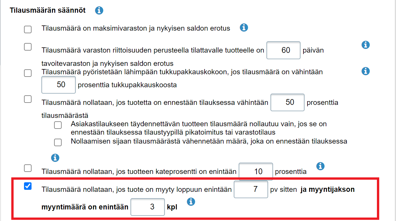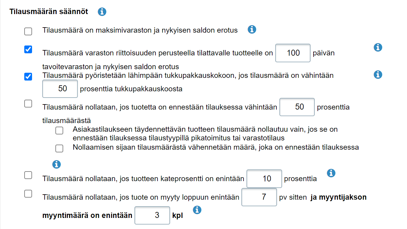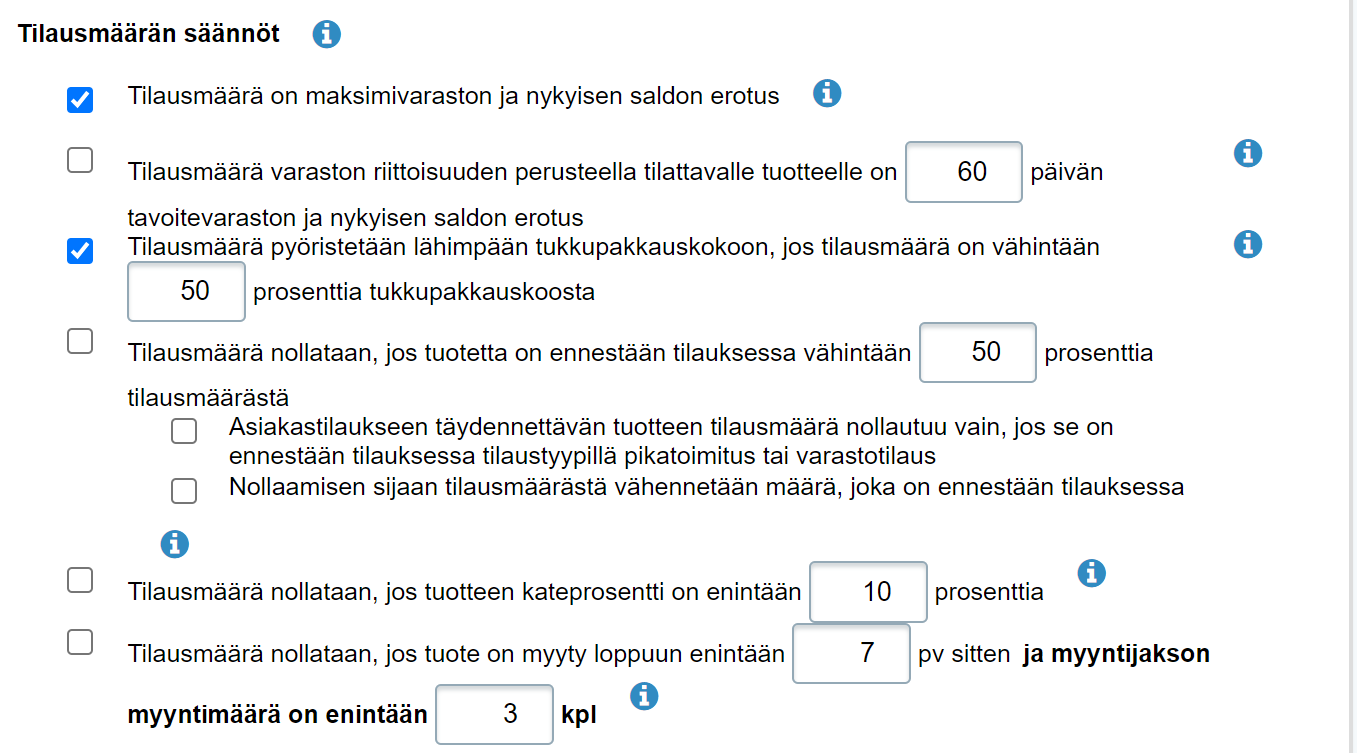 - Tilausmäärän säännöt -kohdassa valitse ainakin ensimmäinen eli Tilausmäärä on maksimivaraston ja nykyisen saldon erotus: