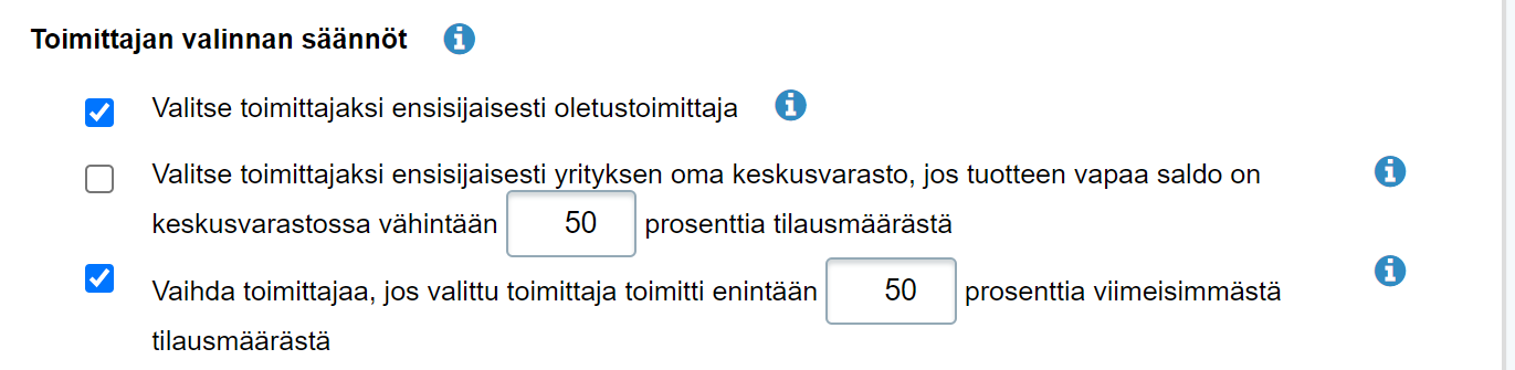 - Jos tuotteita voi tilata useammalta toimittajalta, tilausautomaatti valitsee oletuksena sen toimittajan, jolta tuotteen saa edullisimmalla. Toimittajan valinnan säännöt -kohdassa voit kuitenkin määritellä tähän poikkeuksia, eli valita ensisijaiseksi toimittajaksi oletustoimittajan tai viimeisellä kohdalla varmistaa, että jos toimittajalla on ollut toimitusvaikeuksia, tuotteita tilataan toiselta toimittajalta: