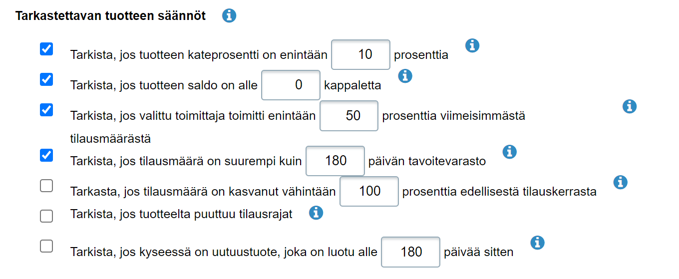- Tarkastettavan tuotteen säännöt -kohdan valinnoilla voit nostaa tietyt automaatin ehdotukset vielä manuaaliseen erityistarkastukseen. Kuvan valinnat ovat ehdotuksia, jotka kannattaa käydä läpi esim. omaa menekkiä ja toimittajavalikoimaa silmällä pitäen ja tarvittaessa muokata automaatin sääntöjä myöhemmin: