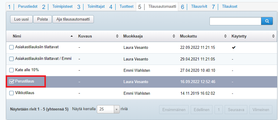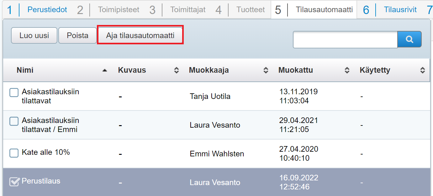 - Valitse Tilausautomaatti-välilehdellä automaattilistauksesta Perusvaraston täydennys -ohjeen mukaisesti yrityksesi tarpeisiin luotu automaatti: