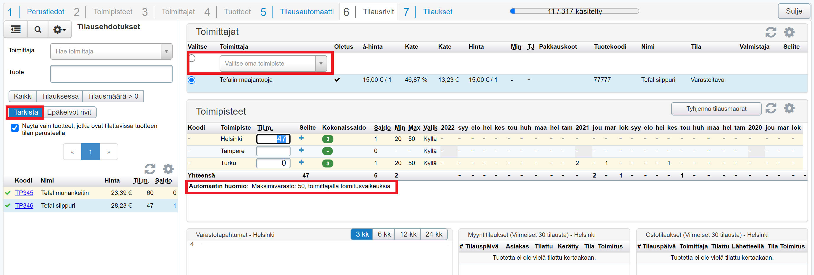 Muista perusvaraston täydennystilausta tehdessä, että tuotetta lisätään tilattavaksi vain, kun tuotteella on vähintään yksi aktiivinen toimittaja. Kun tilausajo tehdään omasta keskusvarastosta, tuotteella on siis oltava myös ulkoinen toimittaja, jotta tilausautomaatti huomioi tuotteen.