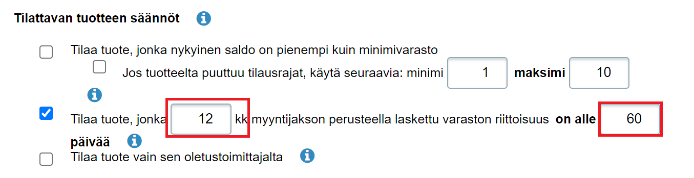- Tilattavan tuotteen säännöt -kohdassa valitse toinen kohta. Määritä, kuinka monen kuukauden myyntijakson menekkiä käytetään laskuperusteena sekä se, koska varastossa varastossa olevat tuotteet ovat automaatin laskujen mukaan loppumassa. Mitä pidemmät toimitusajat ja mitä etupainotteisemmin tilauksia tehdään, sitä suurempi arvo jälkimmäiseen kenttään kannattaa syöttää: