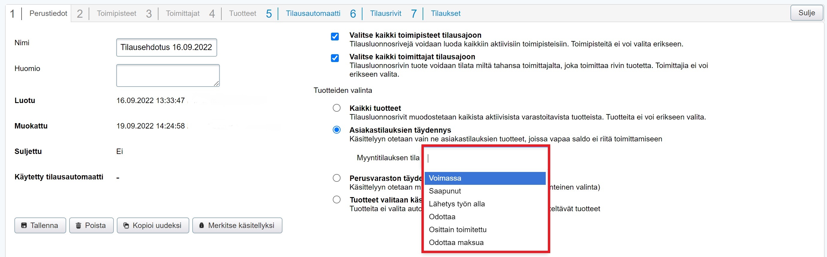 Jos haluat tehdä erillisen tilauksen vain sellaisista tuotteista, joiden saldo ei riitä nykyisten tilausten toimittamiseen, voit rajata tilausajon perustiedoissa tilausajon koskemaan vain asiakastilauksia: