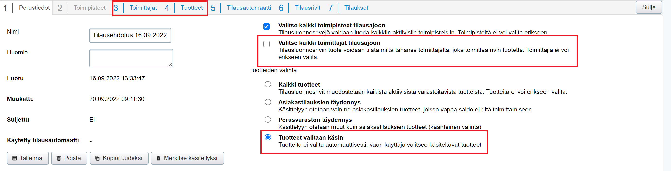 Tästä valinnasta riippuen pääset siirtymään seuraavaksi Toimittajat- ja/tai Tuotteet-välilehdille, joilla valitset manuaalisesti ne toimittajat ja/tai yksittäiset tuotteet/kokonaiset tuoteryhmät, joihin haluat tilausajon kohdistaa. - Kun toimittajat ja/tai tuotteet on valittu, siirry Tilausautomaatti-välilehdelle, luo uusi tilausautomaatti ja nimeä se.