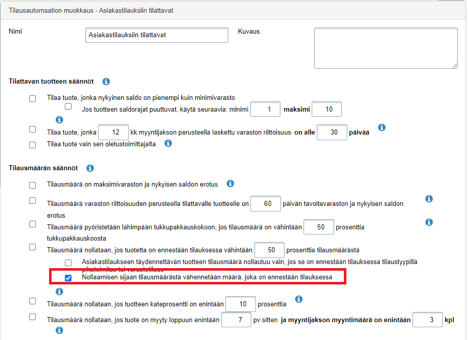 - Jos sopivan prosenttimääräisen säännön määrittely on vaikeaa, voit myös valita kohdan Nollaamisen sijaan tilausmäärästä vähennetään määrä, joka on jo ennestään tilauksessa. Näin tuotetta saadaan varastoon juuri oikea määrä: