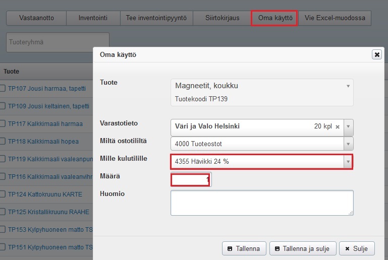 Varastohävikin käsittelyyn ei ole omaa painiketta valmiina, mutta Oma käyttö -painiketta on mahdollista laajentaa Muut kirjaukset -painikkeeksi, jolloin se sisältää Oma käyttö -toiminnon lisäksi yrityksen itse lisäämiä toimintoja. Tätä varten täytyy yleensä ensin luoda uusi kirjanpitotili ja sitten varastokirjausvaihtoehto, joka käyttää uutta tiliä. Katso ohje Yritysasetukset / Hävikin kirjaaminen