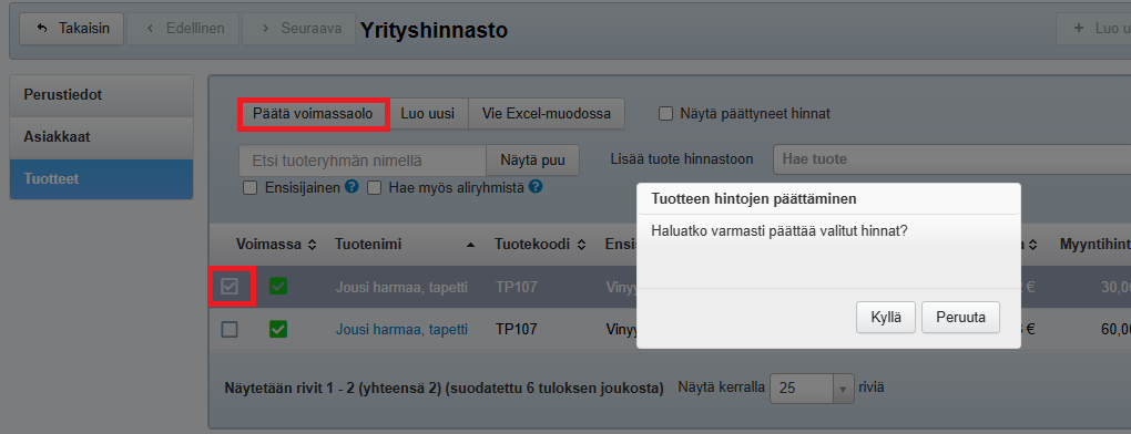 - Jos haluat päättää tuotteen hinnan voimassaolon, valitse tuoterivi ja klikkaa ylhäältä Päätä voimassaolo -painiketta. Tällöin tuotteen hintatieto poistuu hinnastosta.