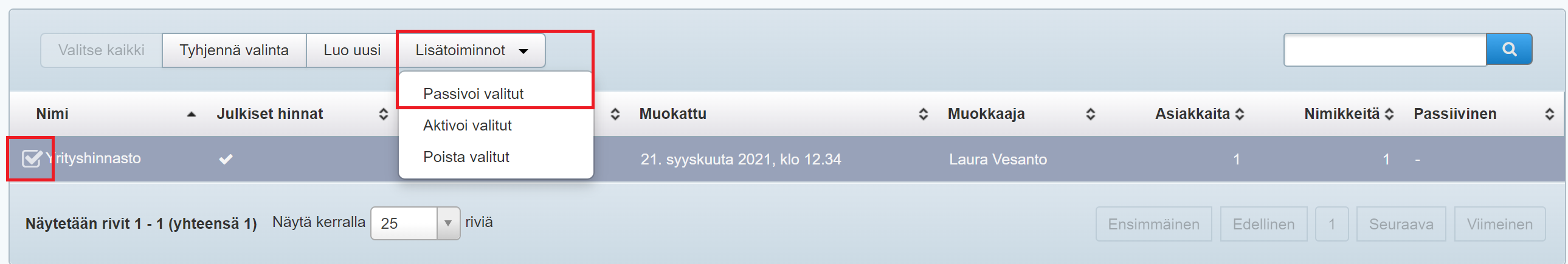 Jos haluat ottaa passivoidun hinnaston uudelleen käyttöön, myös sen aktivointi tehdään Hinnastot-näkymässä: valitse haluamasi passivoitu hinnasto ja sitten Lisätoiminnot-valikoista Aktivoi valitut.