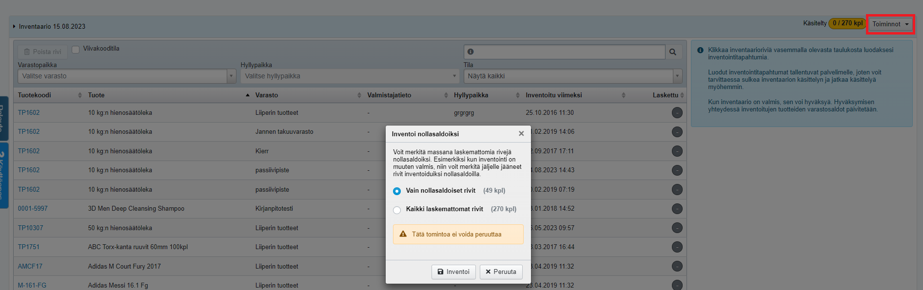 - Inventaarioon sisältyvät rivit näkyvät vasemmalla, ja oikealta löydät ohjeita inventaarion tekemiseen. Oikeassa yläkulmassa olevan Toiminnot-painikkeen takaa löydät lisää mahdollisuuksia: