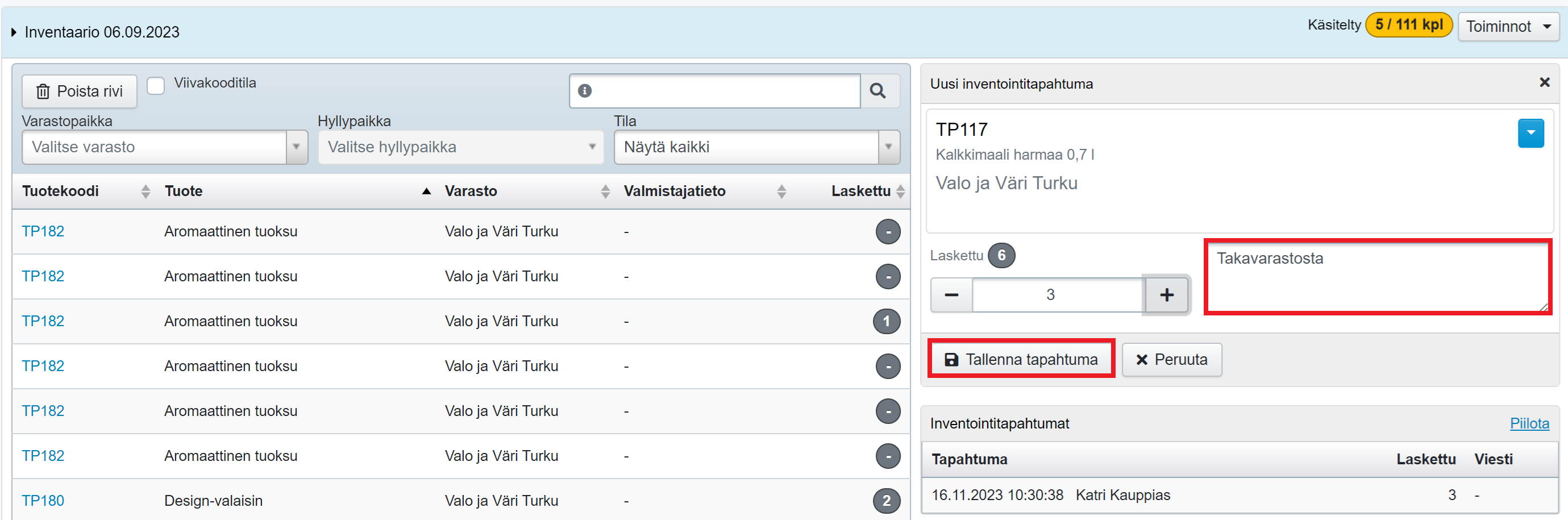 - Klikkaa inventaarioriviä, jolloin oikealle avautuu ikkuna inventointitapahtuman tallentamiseen: