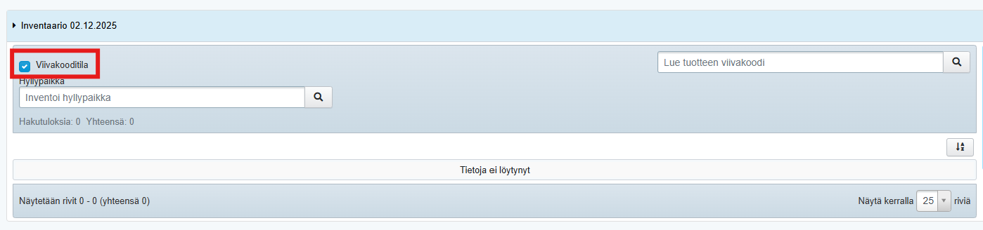 Kun käytät selaimella inventoinnissa viivakoodinlukijaa, inventointiohjelmassa on mahdollista valita käyttöön viivakooditila: