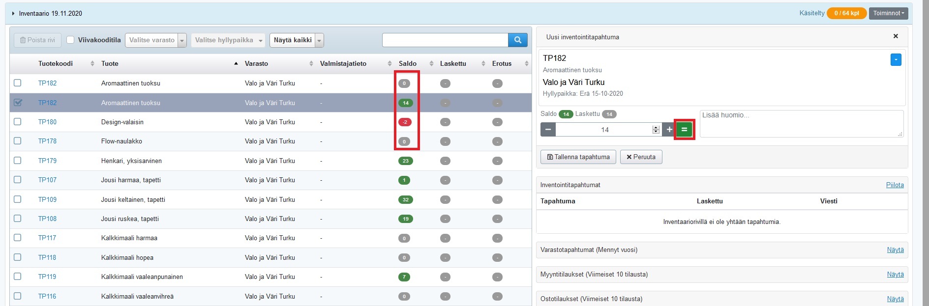 Hallittuun kausi-inventointiin suosittelemme käyttämään siihen tarkoitettua Inventaario-ohjelmaa, joko selaimella tai sovelluksella. Yksittäisiä saldokorjauksia voi tarpeen tullen tehdä myös Varasto-ohjelmalla (joko yksittäisen tuotteen takaa tai Varasto-ohjelman kautta). Nämä saldomuutokset tulevat heti voimaan. Inventaario-ohjelmalla laskennassa havaittu erotus voidaan jättää odottamaan hyväksyntää.