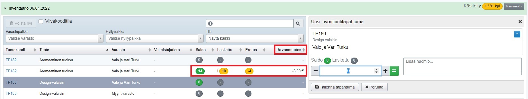 - Jos olet valinnut, että inventointirivien saldot näytetään, näet rivin saldon hyväksynnän jälkeen mahdollisen euromääräisen arvomuutoksen ja Laskettu-sarakkeessa punaisen huutomerkin: