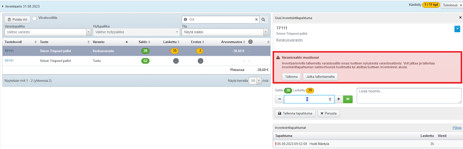 - Huom! Jos inventaarion aikana syntyy epävarmuutta tietyn tuoterivin laskentatapahtumista, voi inventoinnissa aina myös poistaa rivin ja laskea tuotteen uudelleen. Jos samaa tuotetta samalta varastopaikalta lasketaan yhtä aikaa useammassa paikassa ja laskennan aikana toinen Tehden-käyttäjä on tehnyt saldoon muutoksia, Tehden varoittaa tästä Varastosaldo muuttunut -ilmoituksella: