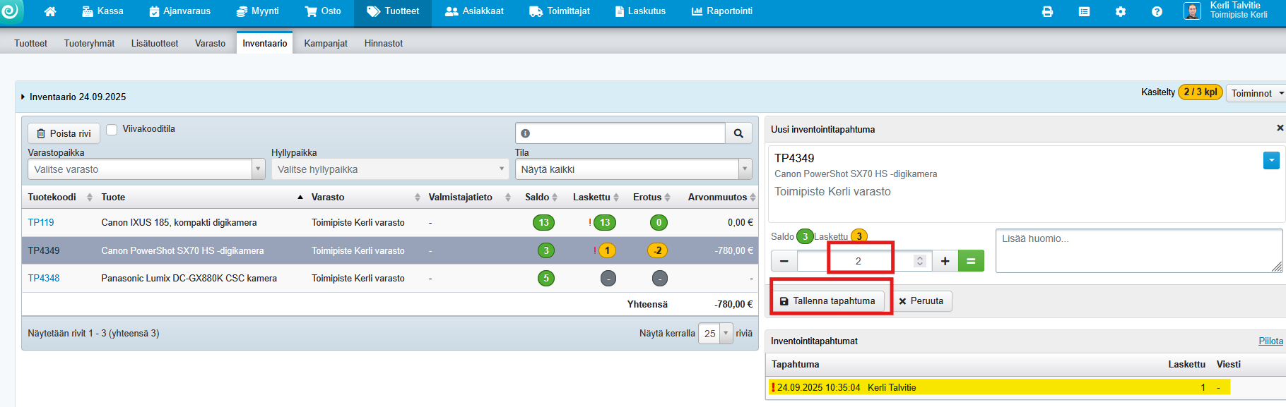 - Esimerkki: Tuotteen varaston puolella olevat kappaleet on laskettu ja inventaarioon merkitty saldoksi 1. Myymälän puolelta myydään tämän kirjaushetken jälkeen 1 kpl tuotetta, jonka jälkeen myymälässä on jäljellä 1 kpl tuotetta. Inventaarioon tulee kuitenkin lisätä 2 kappaletta tuotetta (yhteensä 3 kpl), koska kun inventaario hyväksytään, Tehden vähentää määrästä ne myynnit, jotka on tehty tuotteen ensimmäisen inventointikirjauksen jälkeen.