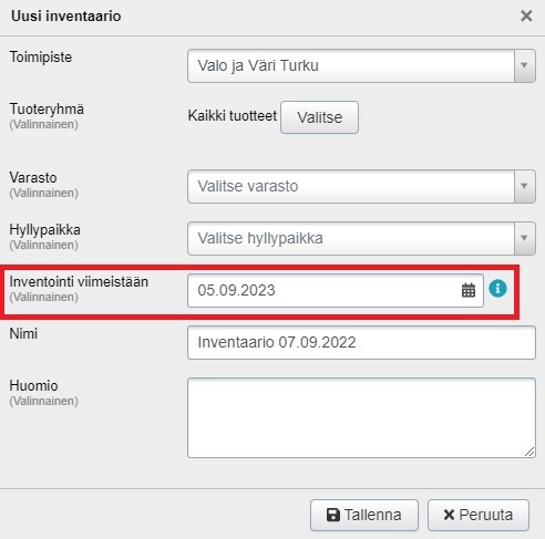 Inventaario hyväksytään päivän päätteeksi 6.9.2022, vaikka kaikkia tuotteita ei ole vielä laskettu. Kun inventaariota jatketaan seuraavana päivänä, valitaan inventaarion luonnissa Inventointi viimeistään -kenttään aiemman inventaarion hyväksymispäivää edeltävä päivä seuraavana vuonna eli tässä tapauksessa 5.9.2023: