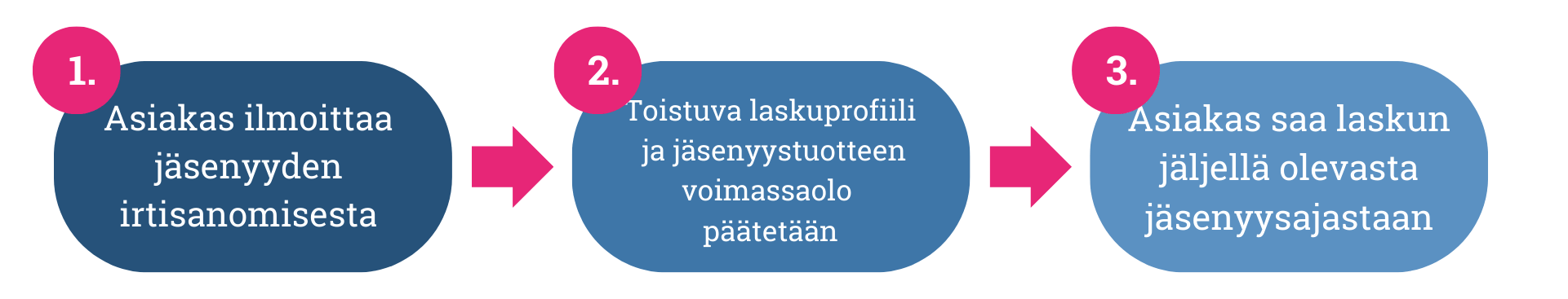 - Laskuta asiakkaalta jäljellä oleva jäsenyysaika yrityksen normaalin laskutuksen yhteydessä. Asiakas maksaa jäsenyyslaskut jäsenyyden voimassaolon loppuun asti ja voi myös käyttää yrityksen palveluita siihen asti.