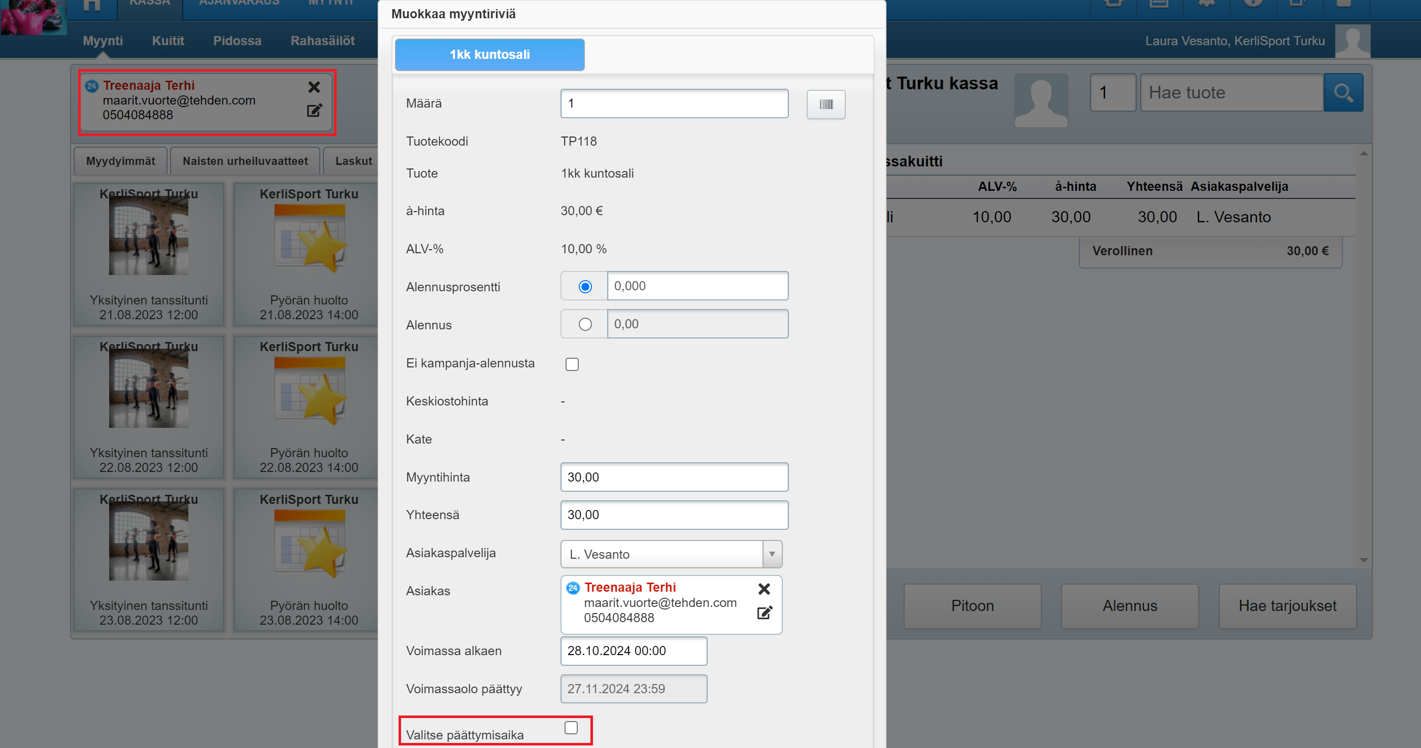 - Myyntirivin muokkaus -ikkuna avautuu automaattisesti ja voit tarvittaessa muuttaa Voimassa alkaen ja Voimassaolo päättyy -päiväyksiä. Muuttaaksesi Voimassaolo päättyy -päiväystä, laita rasti Valitse päättymisaika -ruutuun: