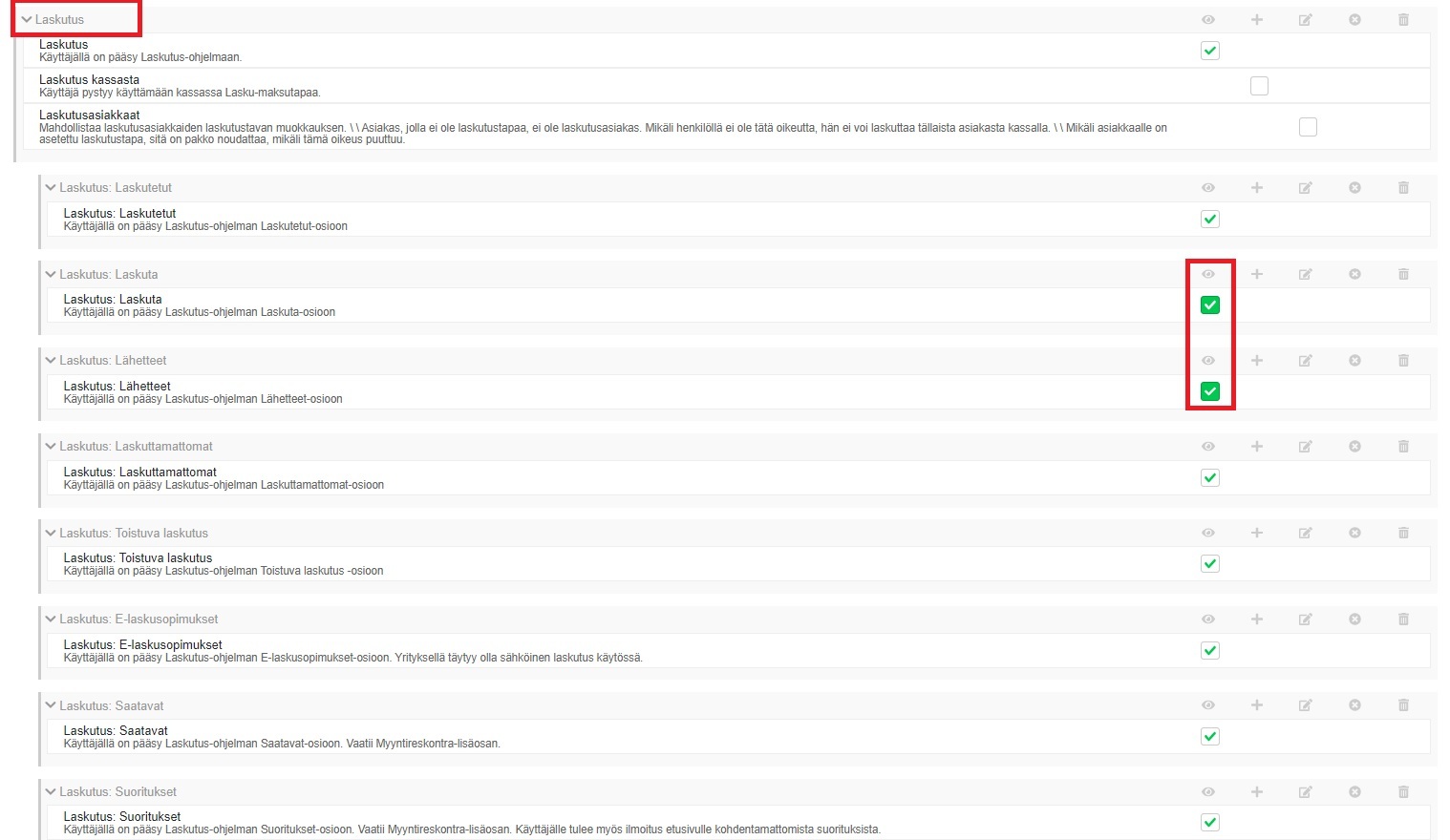 - Myös Laskutusasetukset-ohjelman oikeudet kannattaa käydä läpi, jos rooli vastaa myös laskutuksesta ja roolille voi olla tarpeen muokata esimerkiksi maksuehtoja, laskutusaiheita ja sähköistä laskutusta. Rooli tarvitsee ehkä oikeudet myös myyntireskontra-, ostoreskontra- ja laskupohja-välilehdille: