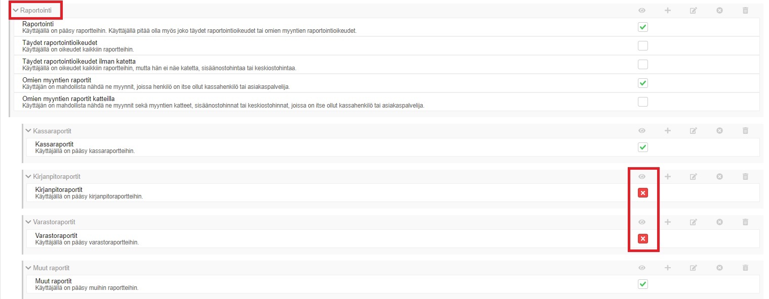- Tavallinen kassatyöntekijä ei tarvitse mitään raportointioikeuksia.