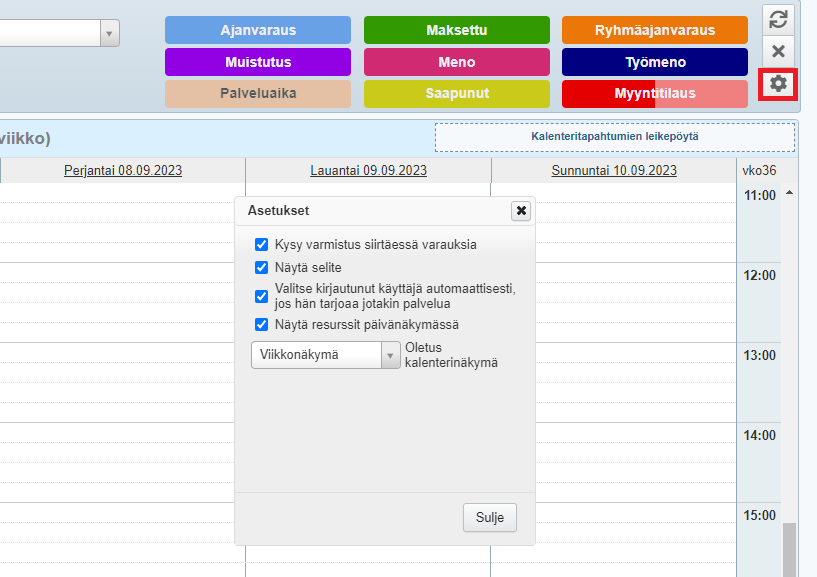 Sekä viikko- että päivänäkymän oikeasta yläkulmasta löytyy rataspainike, jonka kautta voit hallita näkymän asetuksia: