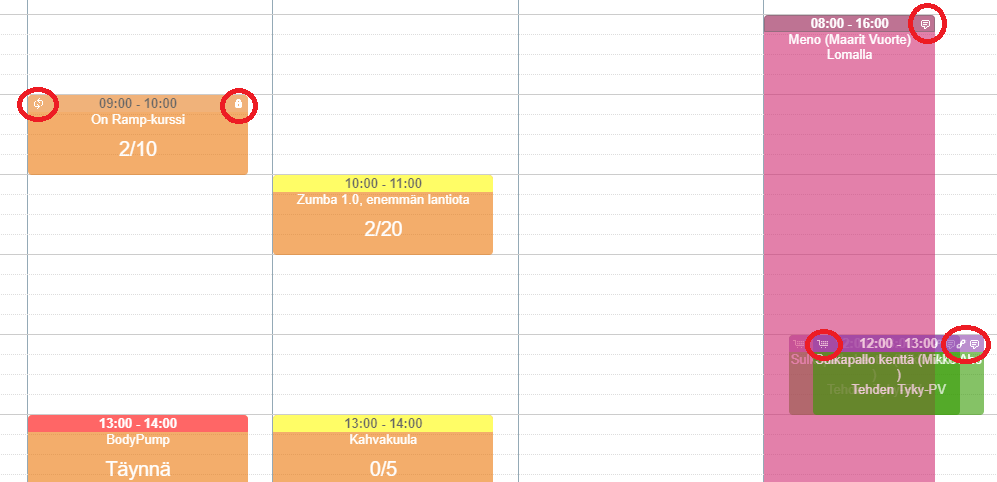 Varausmerkinnöissä on myös käytössä erilaisia kuvakkeita, joiden avulla saat varauksista lisätietoa avaamatta kalenterimerkintää: