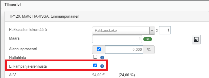 Kun lisäät kassalle tai myyntitilaukselle tuote-/tilausrivin, löytyy sen tiedoista Ei kampanja-alennusta -kohta. Kun valitset kohdan, voimassa olevia kampanjoita ei sovelleta riviin: