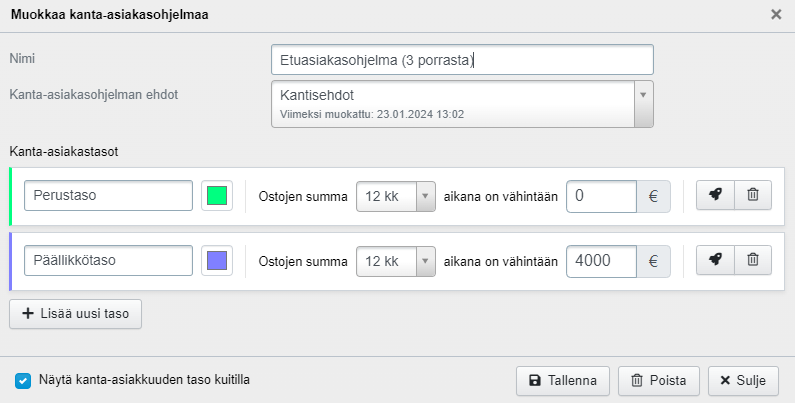 - Asiakkaat siirtyvät automaattisesti tasolta toiselle tässä määriteltyjen ehtojen mukaisesti eli sen perusteella, ovatko asiakkaat tehneet yrityksessäsi ostoja tietyn ajanjakson kuluessa tässä määritellyllä euromäärällä. Tarkempi kuvaus kanta-asiakastasolta toiselle siirtymisestä löytyy kohdasta Miten asiakas siirtyy kanta-asiakastasolta toiselle?