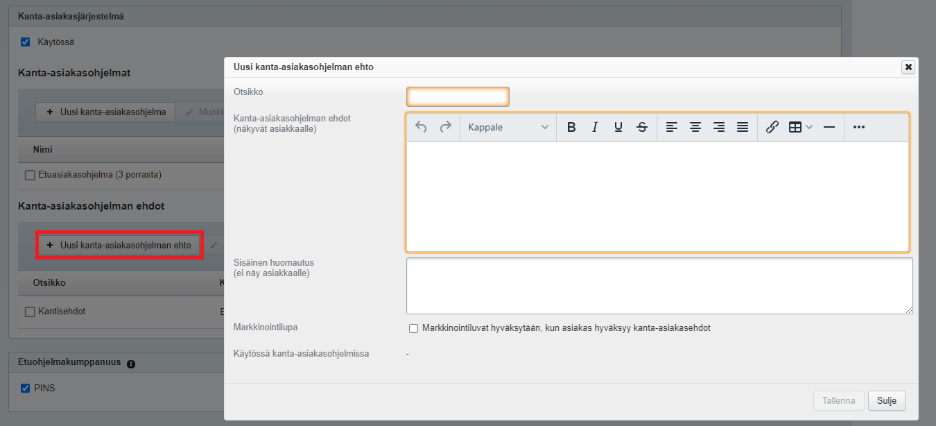 - Ehdoille voi lisätä myös sisäisen huomautuksen. Jos ehdoissa mainitaan, että kanta-asiakasehdot hyväksymällä asiakas antaa yritykselle myös luvan markkinointiin, voit valita kohdan Markkinointiluvat hyväksytään, kun asiakas hyväksyy kanta-asiakasehdot.